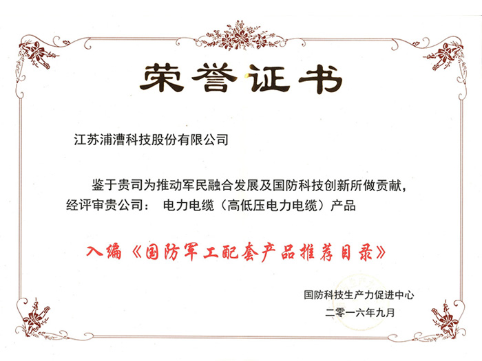 国防军工配套产品推荐目录-荣誉证书