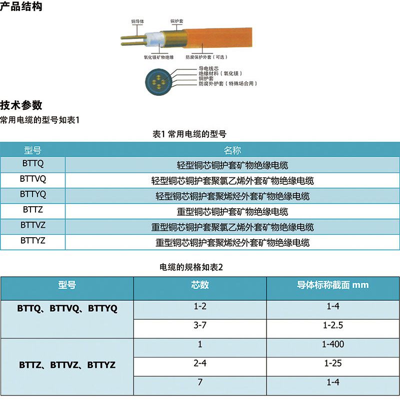 铜护套矿物氧化镁绝缘防火电缆(BTTZ)